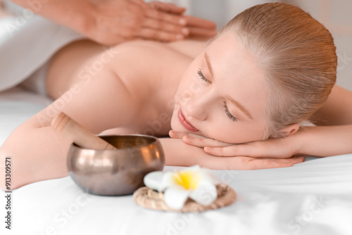 Young woman enjoying neck massage with essential oil in spa salon