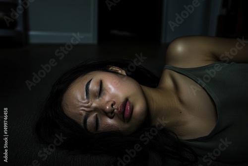 Young Woman Expressing Emotion Lying on Floor in Dim Light Setting