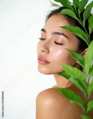beauty, woman, face, spa, girl, skin, natural, cosmetic, plant, make-up, beautiful, care, portrait, clean, health, nature, young, model, fresh, green, female, background, cosmetology, leaf, caucasian, skincare, treatment, attractive, clear, closeup, floral, white, tropics, isolated, white background, closed eyes, relax, calm, well-being, healthy, therapy, wellness, organic, body, peaceful, serene, gentle, delicate