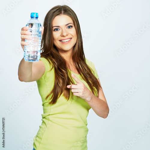 water, woman, young, beautiful, bottle, beauty, female, background, adult, white, healthy, attractive, 1, health, drink, happy, people, person, girl, portrait, caucasian, cute, pretty, smile, lifestyle, body, fitness, isolated, model, blue, hand, show, hair, smiling, style, modern, gym, shape, studio, youth, hold, positive, long, casual attire, green, teenage