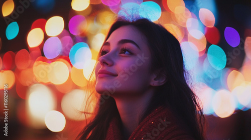 Young woman gazing at colorful lights during nighttime in a festive atmosphere