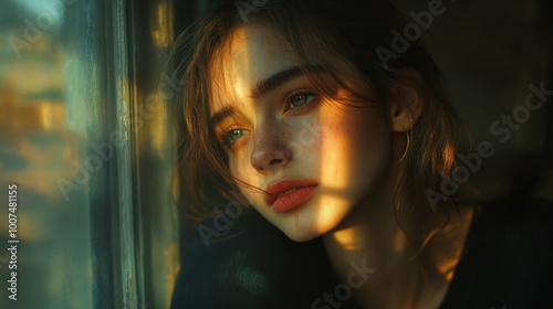 young, woman, gaze, window, light, illumination, soft, beauty, emotion, portrait, calmness, serene, thought, closeup, natural, atmosphere, mood, calm, peaceful, shadow, sunlight, skin, expression, wistful, dream, dreamy, face, eye, hair, warmth, femininity, innocence, solitude, indoor, moment, daydream, pensive, longing, charme, brightness, aesthetic, youth, feeling, stillness