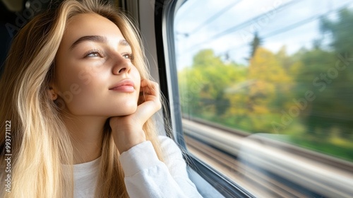 Young Woman Gazing Out Train Window in Scenic Landscape