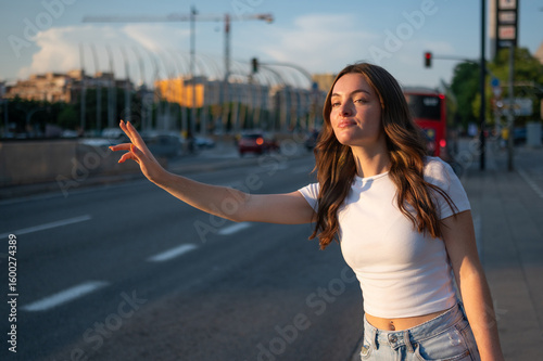 woman, taxi, cab, city, street, sunset, urban, transportation, travel, holiday maker, calling, ride, waiting, evening, summer, lifestyle, destination, commuting, passenger, vehicle, traffic, road, city landscape, building, girl, young, casual attire, fashion, waving, hand, gesture, outdoors, golden hour