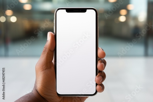 Young woman hands holding cell phone finger touching on mockup white blank display.