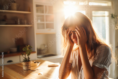 Young woman having panic attack in kitchen. Struggling with anxiety and mental health. Sunlight backlit.