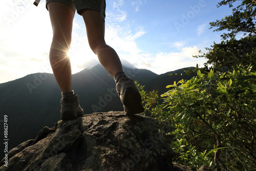 young woman hiker legs on sunrise mountain peak rock