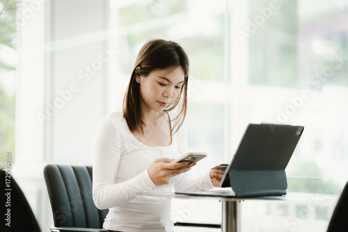 woman, female, young adult, laptop, computer, smartphone, mobile, credit card, payment, finance, shopping, online shopping, e-business, cyberspace, banking, financial, technology, transaction, purchase, electronic, client, consumer, business, money, commerce, modern, lifestyle, cafes, cafes, freelancer, working, professional, stylish, cashless, people, smiling, casual attire, communication, connection, workspace, wireless, productivity