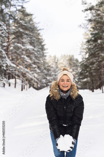 young woman holding heap of snow in her hands during her walk in winter park