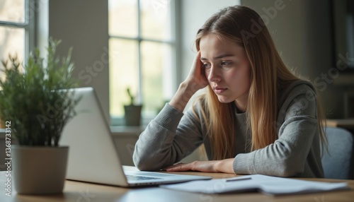 woman, young, 20s, laptop, computer, home office, bored, frustrated, sleepy, telecommuting, routine, isolation, modern, lifestyle, work, desk, technology, screen, business, casual attire, indoor, workspace, job, monotony, expression, fatigue, professional, telecommute, freelance, home, student, cyberspace, studying, online, course, plant, window, design, decor, interior, grey, sweater, blond, hair, office