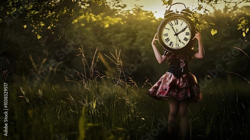 woman, clock, field, grass, dress, floral, antique, sunset, time, sun, vintage, nature, portrait, outdoors, art, fantasy, gold, green, leaf, light, shadow, tree, sky, cloud, summer, spring, young, female, fashion, style, beauty, abstract, holding, head, large, over, meadow, rural, pasture, daytime