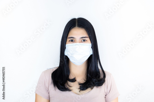 Young woman in a medical mask isolated over white background. Asian woman in face mask during a virus outbreak. Work from home concept. Women face mask.