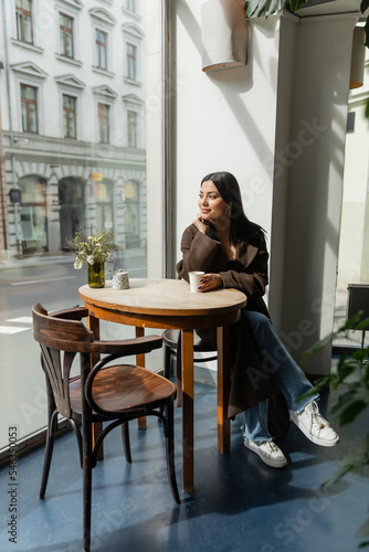 young woman in autumn coat sitting in cafe near window and looking at street in prague.