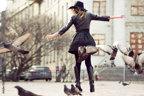 adult, autumn, beautiful, beauty, bird, blond, charming, city, cool, cute, day, dove, elegance, elegant, feather, female, feminine, flight, fly, free, fun, girl, group, happiness, happy, hat, joy, life, lifestyle, outdoors, park, people, pigeon, positive, pretty, season, skirt, smile, spring, street, style, up, walking, wild, wing, woman, young, young adult