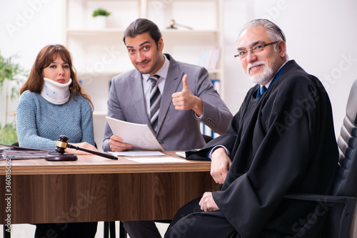 man, woman, lawyer, judge, justice, law, legal, court, barrister, decision, verdict, legislation, courtroom, proceeding, hammer, ruling, lawsuit, case, advocate, lawyer, trial, defense, client, client, discussing, rule, explaining, neck, braces, collar, cervical, whiplash, accident, insurance, compensation, injury, injured, claim, medicals, coverage, damage, money, giving, thumb, thumb, up, paper, contract