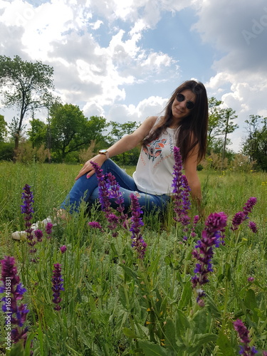 woman, field, summer, beauty, nature, spring, flower, meadow, flower, grass, people, outdoors, person, lavandula, dress, model, happiness, smile, sky, fashion, fun, joy, smiling, purple