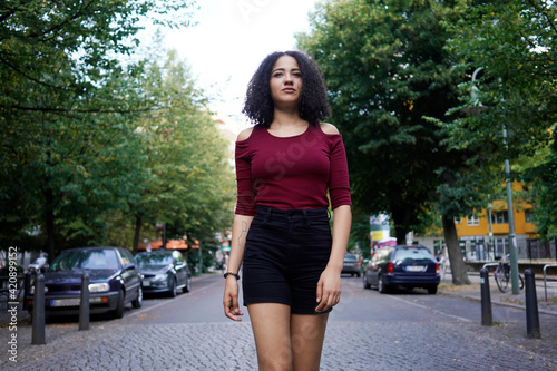 Young woman in middle of street, Berlin, Germany