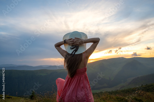 Young woman in red dress standing on grassy field on a windy evening in autumn mountains enjoying view of nature.