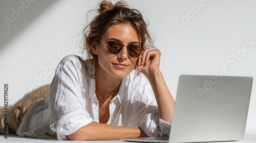 woman, laptop, sunglasses, casual attire, relaxed, indoor, sunlight, technology, workspace, remote, sharpened, content, aesthetic, joy, leisure, creativity, modern, lifestyle, sitting, connection, cyberspace, fashion, comfort, productivity, digital, youthful, attractive, screen, communication, analysing, casual clothes, enjoyable, well-being, natural, bright, simplicity, fresh, engagement, home, trendy, young adult, happiness, innovative, inspiration, daydreaming