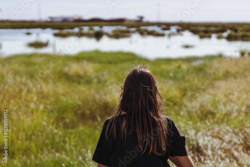 serenity, backview, backward, enjoying, disconnection, connecting, nature, woman, adult, caucasian, long hair, landscape, wetland, delta, spain, countryside, grass, water, lagoon, nature reserve, ecology, conservation, calmness, relaxation, exploration, tour tourism, adventure, get-away, hiking, walk, outdoors, biodiversity, flora, fauna, sky, horizon, photo, composition, natural light, summer