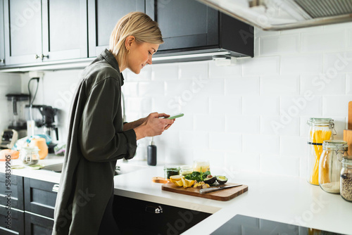 avocado, blond, brunch, cooking, chopping board, electronic, fan, food, fruit, furniture, healthy, home, homemade, indoor, juice, kitchen, knife, lemon, mobile phone, phone, preparing, smoothie, snack, stove, table, tap, well-being, woman, young