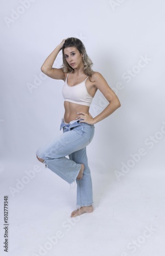woman, jean, fashion, beauty, model, hair, people, casual attire, studio, posing, person, 1, blue, standing, blond, lady, brunette, smile, shirt, slim, teenage, fashion model, body, style, smiling