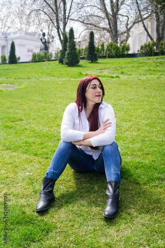 adult, alone, beautiful, caucasian, city, closeup, female, fresh, garden, grass, green, jean, lady, lawn, lifestyle, long hair, natural, nature, outdoors, park, people, person, real, red, spring, springtime, street, summer, holiday maker, travel, white, white shirt, woman, young
