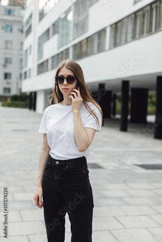 Young woman in white t-shirt standing in front of grey building and using smartphone. Urban style and street fashion. Girl in sunglasses with phone. Chatting, messaging, reading
