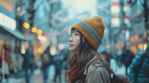 Young woman in yellow winter hat exploring a bustling city street, capturing a moment of urban life in winter.