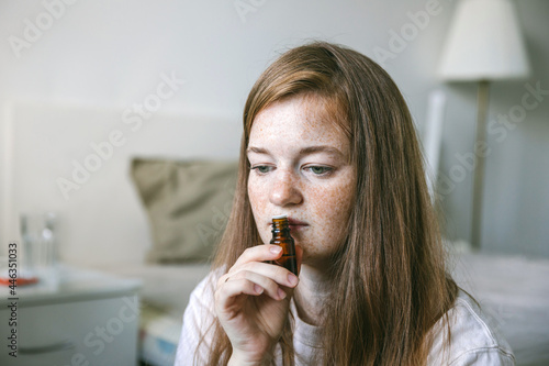 Young woman is sniffing essential oil. Loss of smell and taste from Covid