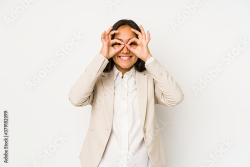 Young woman isolated on a white background showing okay sign over eyes