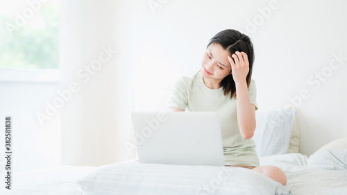 working, freelancer, chinese, laptop, computer, indoor, home, young, woman, bedchamber, bright, plain, clean, beautiful, confident, healthy, room, white, life, way of life, alone, comfortable, leisure, nature, happy, smile, short hair, vest, suspenders, cosy, girl, woman, portrait, daytime, minimalism, cute, optimistic, blank, modern, smile, japanese, asian