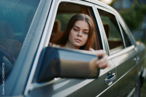 Young woman looking out of a car window, enjoying the scenic view with a relaxed expression. Perfect for travel and adventure themes.