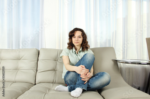 sofa, sitting, woman, person, relaxation, 1, home, young, female, adult, people, interior, smiling, room, beautiful, comfortable, living, domestic, casual attire, at, horizontal, indoor, leisure, 20s, beauty, enjoyment, lifestyle, hair, happiness, caucasian, looking, only, leg, year, woman, attractive, knee, youth, house, curly