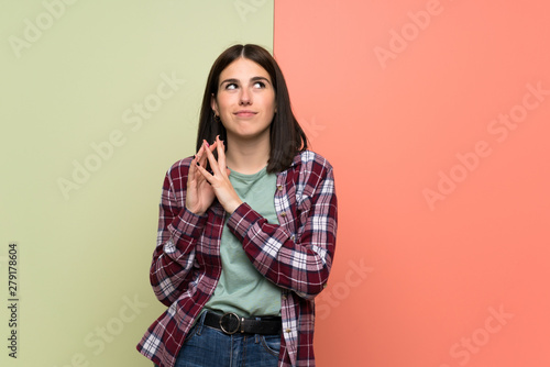 Young woman over isolated colorful wall scheming something