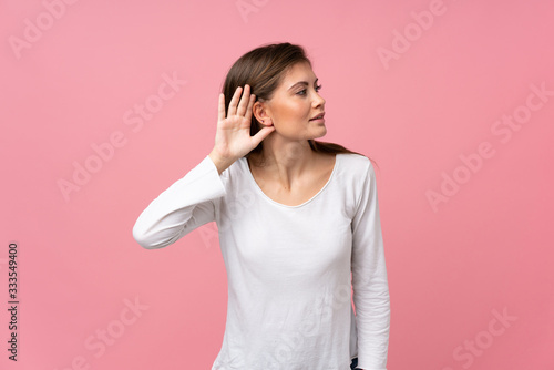Young woman over isolated pink background listening to something by putting hand on the ear