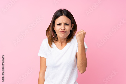 girl, woman, woman, people, person, lady, female, young, adult, hispanic, caucasian, brunette, colours, colourful, background, wall, isolated, pink, aggressive, combat, defense, fight, fighter, punch, furious, sad, angry, serious, unhappy