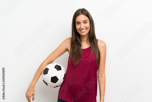 girl, woman, woman, people, person, lady, female, attractive, beauty, casual attire, young, adult, hispanic, caucasian, brunette, pretty, background, wall, isolated, white, ball, soccer, football, sport, circle, play, game, competition, sphere, leisure