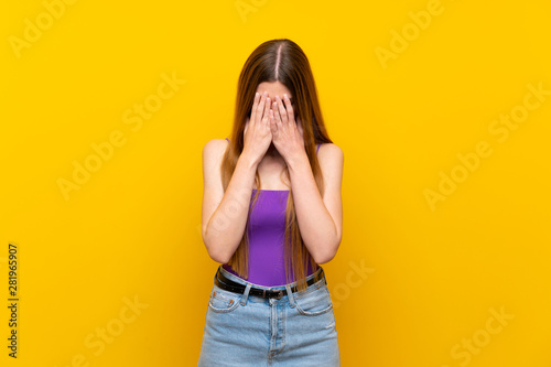 girl, woman, woman, people, person, lady, female, attractive, youth, young, casual attire, colours, colourful, background, wall, isolated, yellow, beauty, pretty, sleepy, portrait, sick, emotion, problem, ill, head, depression, lazy, expression, sad, stress, stressed, exhausted