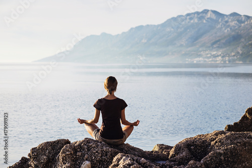 Young woman practicing yoga near the sea. Harmony and meditation concept. Healthy lifestyle