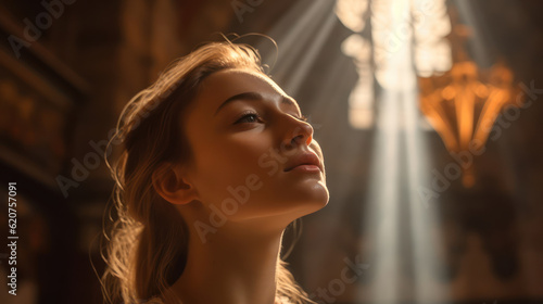 Young woman praying to god in church
