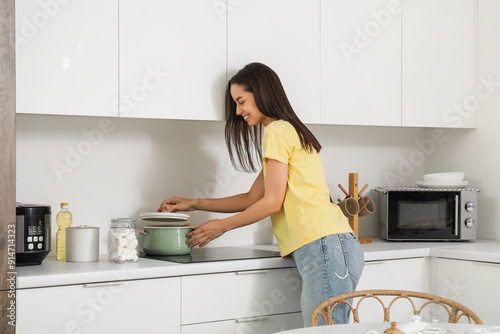 kitchen, modern, pot, putting, stove, woman, young, adult, apartment, attractive, background, beautiful, caucasian, colours, contemporary, cook, cooking, counter, decor, design, detail, dining, element, female, flat, food, furniture, girl, happy, home, house, household, housekeeping, indoor, interior, leisure, lifestyle, light, people, person, portrait, pretty, room, smiling, style, stylish, table, white