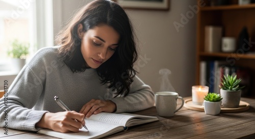 young woman reading a book in the kitchen