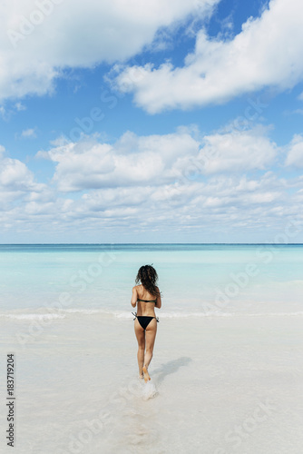 beach, woman, young, vacation, walking, summer, body, sea, sand, hat, bikini, beautiful, female, girl, lifestyle, swimwear, holiday, attractive, adult, into, happy, paradise, travel, nature, caucasian, ocean, beauty, standing, people, 1, wave, model, pretty, backview, outdoors, sunny, relaxing, brunette, copy space, sky, cloud