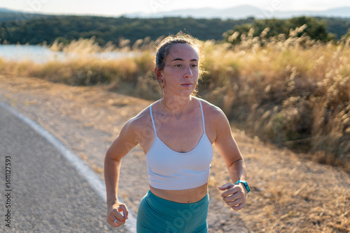Young woman running on a country road at sunset: exercising outdoors in summer