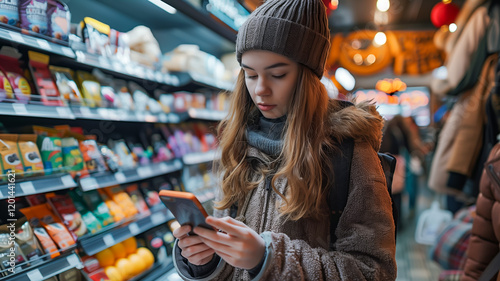 young, woman, shopping, smartphone, store, grocery, aisle, casual attire, technology, brunette, hat, engagement, modern, clothes, winter, relaxation, consumer, youth, female, browsing, retail, lifestyle, sharpened, concentration, product, shelf, indoor, fashionable, bag, portrait