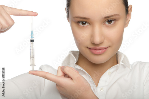 syringe, injection, needle, treatment, procedure, drug, vaccine, doctor, macro, healthy, white background, woman, female, uniform, work, person, studio shot, care, lady, young adult, 1, health, occupation, horizontal, nurse