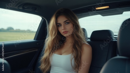 Young woman sitting in the backseat of a car with a thoughtful expression in a countryside setting during late afternoon