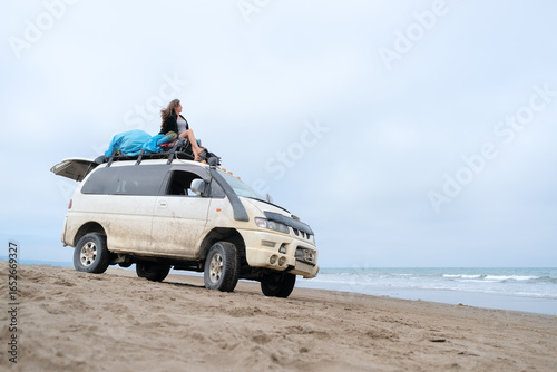 Young woman sitting on roof of adventure vehicle gazing at misty ocean from sandy beach. Perfect for road trip and van life concepts.
