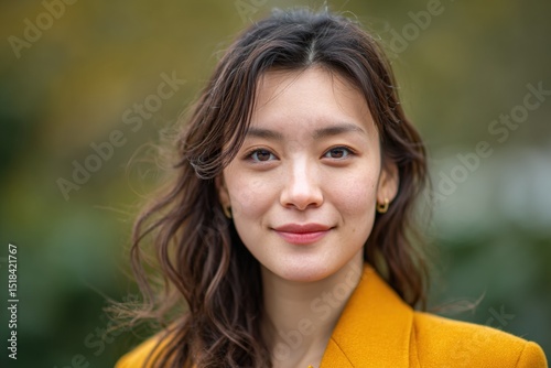 Young woman smiles confidently outdoors, wearing yellow jacket. Portrait of a smiling Asian woman, beauty, fashion